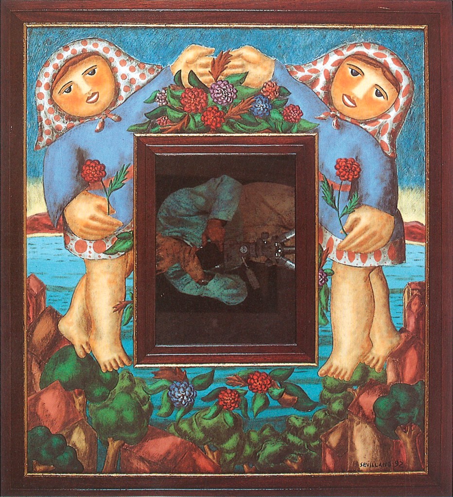 De esta experiencia en América, la obra de Sevillano se impregna de luz y colores vivos así como de nuevos personajes y escenarios que se entremezclan con los del viejo continente. En un homenaje a los lazos y la herencia latina e hispana, que han unido España y América durante quinientos años de historia. Sus personajes ahora visten sombreros, plumas y trajes con patrones geométricos amerindios. Así como vistosas joyas, y cabellos de tonos azules y verdes. Exuberante vegetación y paisajes con aguas color turquesa. Personajes que danzan, flotan, se abrazan y ríen en constante celebración.