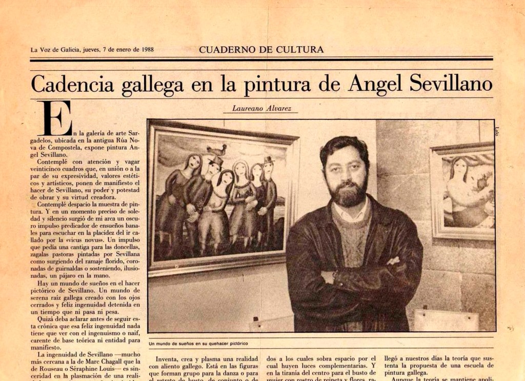En Enero de 1987 Sevillano regresa a España para residenciarse en Vilagarcía de Arosa, Pontevedra, donde ejerce como profesor de dibujo en el Instituto de Bachillerato de Carril. Es a partir de ahora cuando crea sus obras más deseadas y emblemáticas: además de la aparición de personajes y temáticas americanas, incorpora en sus óleos laminas de pan de oro de 24 kilates y pan de plata.