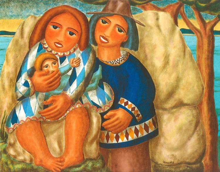Sevillano painted this oil in 1992, upon returning to Spain, in an allegory of the international family he formed with Spanish and American roots. In the background landscape appear the unmistakable Rías de Galicia with the silhouettes of the mountains and their vegetation, and a sunset in golden tones over which nightfall can already be seen. The representation of the father, as a Wayuu Indian, indigo blue hair, wearing a hat and clothes with the typical geometric designs; the Spanish mother, with a child on her lap and dressed in rhombuses in light blue tones, plays with the remaining variety of blues in the painting. We can appreciate the technique of shading and lighting that Sevillano developed, and that defines very well the characteristic faces of his characters.