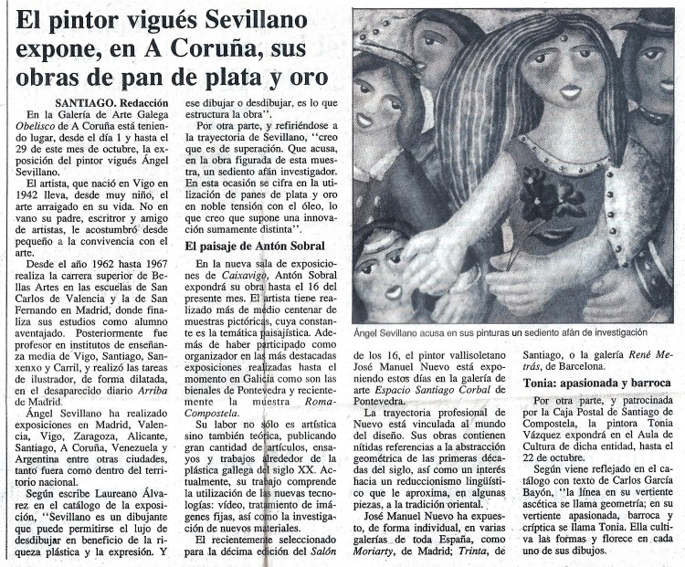 In January 1987 Sevillano returns to Spain to reside in Vilagarcía de Arosa, Pontevedra, where he works as a drawing teacher at the Carril High School Institute. It is from now on that he creates his most desired and emblematic works: in addition to the appearance of American characters and themes, he incorporates 24-carat gold leaf and silver leaf in his oil paintings.