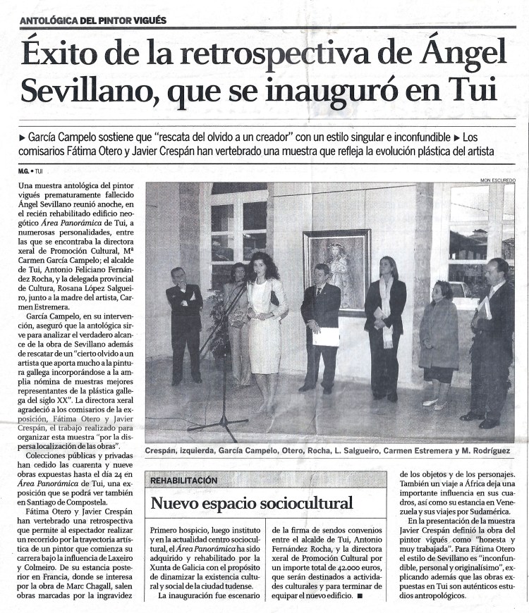 In 2003, an anthological exhibition of Sevillano is held and the Government of Galicia publishes a catalogue, presented by Jesús Pérez Varela, Minister of Culture of the Xunta de Galicia and María del Carmen García Campelo, General Director of Cultural Promotion.